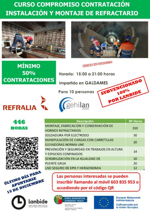 | INSTALACIÓN Y MONTAJE DE REFRACTARIO | CC25480024 | REFRALIA | 446 | 12/2025 | 05/2026 | MUSKIZ | 15:00 – 21:00 | Desempleados/as |