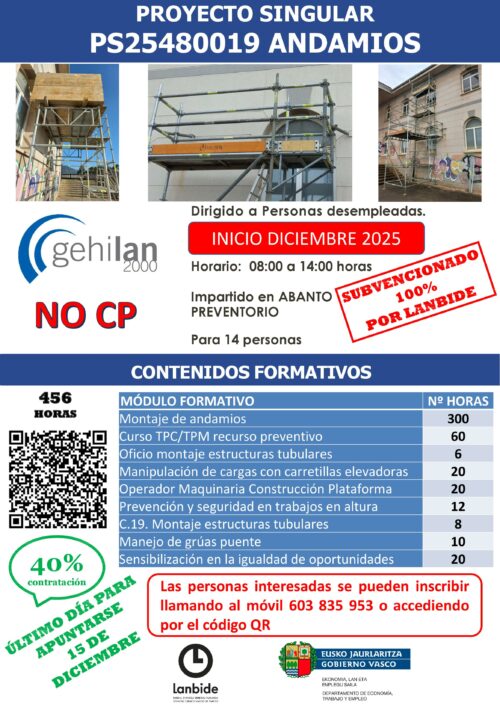 | MONTAJE DE ANDAMIOS | PS25480019 | 456 | 12/2025 | 05/2026 | ABANTO | 08:00 – 14:00 | Desempleados/as | |
