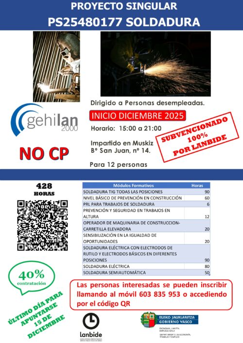 | SOLDADURA | PS25480177 | 428 | 12/2025 | 05/2026 | MUSKIZ | 15:00 – 21:00 | Desempleados/as |
